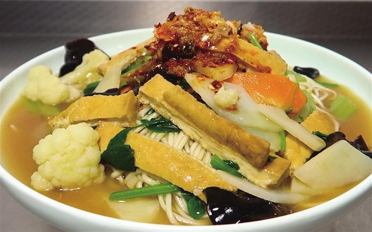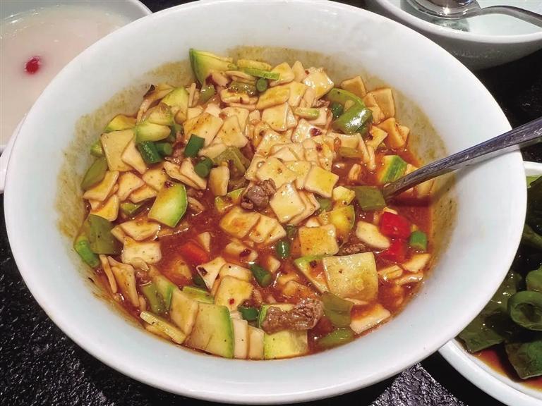 搭(da)配(pei)吸滿醬汁(zhi)的(de)油炸(zha)凍豆腐,再淋上一口酸辣蒜汁(zhi),這種來(lai)自碳(tan)水的(de)誘餌很難令人抵抗。蘭州鹵(lu)面(mian)的(de)面(mian)條與牛肉面(mian)一樣,都(dou)是(shi)技(ji)藝(yi)精湛的(de)拉面(mian)師(shi)傅親手(shou)拉出(chu)來(lai)的(de),湯(tang)汁(zhi)用油炸(zha)凍豆腐和(he)多種素(su)菜(cai)混以牛肉面(mian)原湯(tang)勾芡,文火慢煮,再澆到新(xin)出(chu)鍋的(de)面(mian)條上。