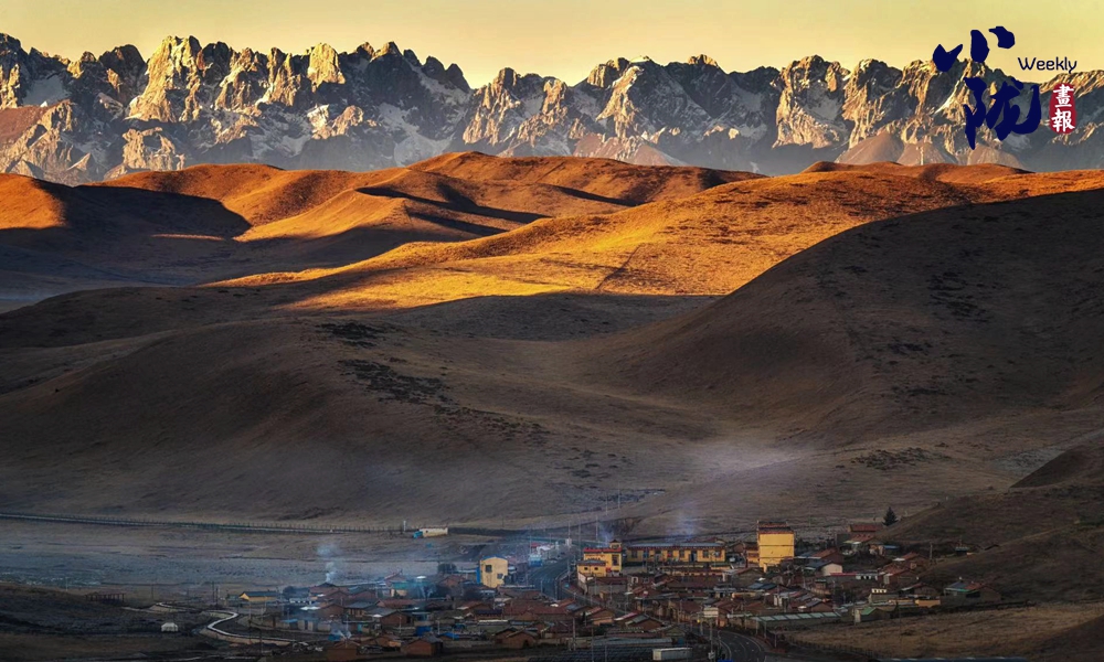 遠處連綿的群山白雪皚皚,山下青黃的草甸、安(an)靜的藏式小村、飄蕩(dang)的經幡、裊(niao)裊(niao)炊煙,勾勒出一幅美麗的畫。