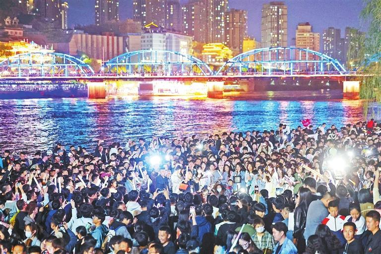 作為蘭(lan)州(zhou)(zhou)的(de)地標之一,中山橋已經是來蘭(lan)游客(ke)(ke)必(bi)“打卡”的(de)景點。火(huo)熱(re)“出圈”的(de)“黃河大合(he)唱(chang)”成為蘭(lan)州(zhou)(zhou)旅游新體驗。華燈初(chu)上,游客(ke)(ke)和市(shi)民齊(qi)聚黃河岸邊,隨(sui)著音樂齊(qi)聲合(he)唱(chang),場面壯觀,氣(qi)氛熱(re)烈。“五一”假期首日,蘭(lan)州(zhou)(zhou)文(wen)旅市(shi)場迎來火(huo)爆“開門紅”,接待游客(ke)(ke)達到了(le)86.42萬人(ren)次。