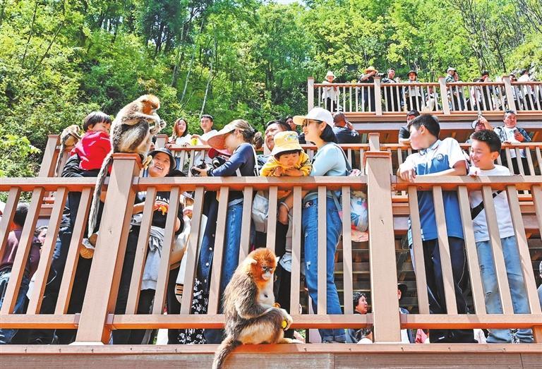 游客在隴南市(shi)武都區裕河鎮與川金絲猴(hou)親密接觸。新(xin)甘肅·甘肅日報(bao)記者 丁凱(kai)