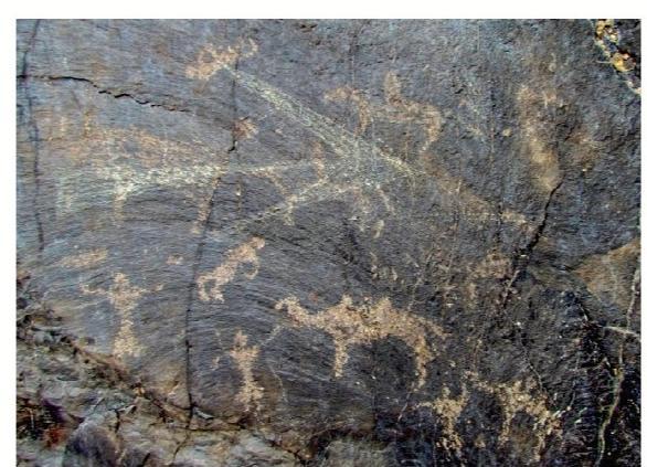 黑(hei)(hei)山(shan)(shan)巖畫全稱為“黑(hei)(hei)山(shan)(shan)摩崖淺石(shi)刻巖畫”,分(fen)布于嘉(jia)峪關西北約 10—20公(gong)里處的(de)黑(hei)(hei)山(shan)(shan)峽谷陡崖峭壁上(shang),為遠古(gu)時期黑(hei)(hei)山(shan)(shan)地(di)區游牧民族(zu)生產、生活(huo)的(de)真實記(ji)錄(lu)。現共發現分(fen)布在黑(hei)(hei)山(shan)(shan)石(shi)關峽口、磨子溝(gou)、蕉蒿(hao)溝(gou)、四道股形溝(gou)、紅柳溝(gou)、交河溝(gou)六處戰國至明代(dai)時期的(de)巖畫,共 157 幅(fu)。黑(hei)(hei)山(shan)(shan)巖畫反映(ying)的(de)時限跨度大,時空關系復雜,涉及(ji)部族(zu)較(jiao)多(duo)。畫面(mian)所(suo)反映(ying)的(de)內容豐富多(duo)彩(cai),有(you)動物(wu)、人(ren)物(wu)、佛(fo)塔、植物(wu)等,還(huan)有(you)大型的(de)操練舞(wu)蹈(dao)場景。涉及(ji)人(ren)類學(xue)、社(she)會學(xue)、歷(li)史(shi)學(xue)、考古(gu)學(xue)、美(mei)術學(xue)、生物(wu)學(xue)、地(di)理(li)學(xue)等多(duo)個學(xue)科,具有(you)較(jiao)高的(de)研究價值。