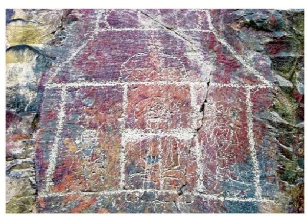 黑山(shan)巖(yan)畫(hua)中(zhong)的(de)(de)晚期巖(yan)畫(hua),主要反(fan)映宗(zong)教(jiao)(jiao)文(wen)化。紅柳(liu)溝、石(shi)關峽(xia)口(kou)巖(yan)畫(hua)中(zhong)的(de)(de)殿堂(tang)、佛(fo)(fo)(fo)塔(ta)、佛(fo)(fo)(fo)像(xiang)、古(gu)藏(zang)文(wen)題刻(ke)(ke),可能(neng)屬(shu)于唐(tang)代中(zhong)期以后的(de)(de)宗(zong)教(jiao)(jiao)遺物。藏(zang)傳佛(fo)(fo)(fo)教(jiao)(jiao)在 7世(shi)紀時同古(gu)藏(zang)文(wen)一(yi)起為吐(tu)(tu)蕃(fan)松贊干布創立。據史(shi)書(shu)記(ji)載,唐(tang)因平定“安史(shi)之亂”,河西空虛(xu),吐(tu)(tu)蕃(fan)乘機占領河隴之地達(da) 100 余年。吐(tu)(tu)蕃(fan)人居住河西,在紅柳(liu)溝、石(shi)關峽(xia)刻(ke)(ke)畫(hua)佛(fo)(fo)(fo)教(jiao)(jiao)殿堂(tang)、菩薩、佛(fo)(fo)(fo)像(xiang)、佛(fo)(fo)(fo)塔(ta)是完全可能(neng)的(de)(de)。由此推斷,黑山(shan)紅柳(liu)溝、石(shi)關峽(xia)口(kou)佛(fo)(fo)(fo)塔(ta)、佛(fo)(fo)(fo)像(xiang)及藏(zang)文(wen)題刻(ke)(ke)為唐(tang)中(zhong)期以后的(de)(de)吐(tu)(tu)蕃(fan)所留。