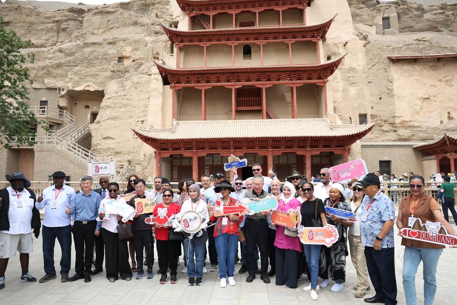 6月6日至8日,來自22個國(guo)家的(de)駐華使節和高(gao)(gao)級(ji)別外交官(guan)走(zou)進(jin)敦煌,尋(xun)訪莫高(gao)(gao)窟,游覽(lan)鳴(ming)沙山月牙(ya)泉景區,參加河西走(zou)廊五市的(de)文旅(lv)專場推介會(hui),并(bing)在對話會(hui)上(shang)共(gong)同探討“絲(si)路精神(shen)推動文明交流互鑒”。