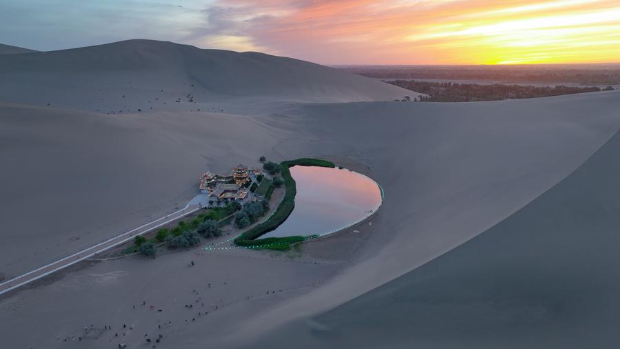 這是6月6日拍攝的鳴沙山月牙泉(無人機照片)。新華社記者 郎兵兵 攝