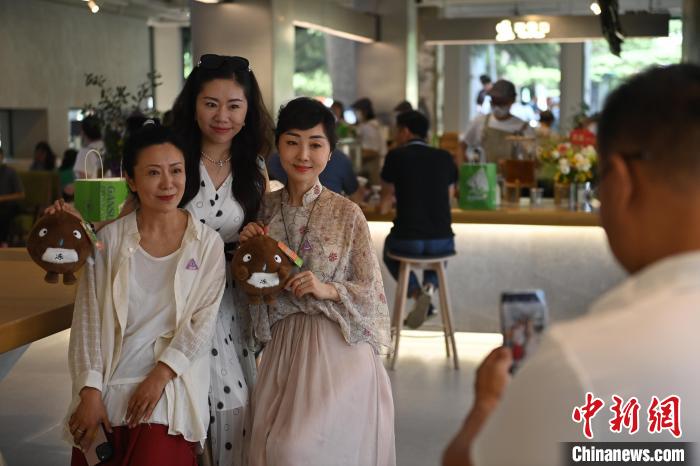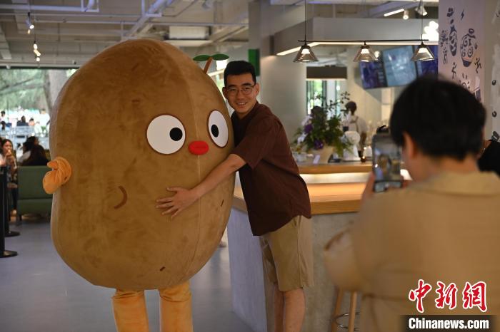 6月(yue)19日(ri),甘(gan)肅(su)省博(bo)物(wu)(wu)館(guan)(guan)藝術生活館(guan)(guan)在(zai)甘(gan)肅(su)蘭州開館(guan)(guan)。該(gai)館(guan)(guan)是甘(gan)肅(su)省博(bo)物(wu)(wu)館(guan)(guan)打造的一(yi)處復合(he)(he)型(xing)高價值文化(hua)空(kong)間(jian),融合(he)(he)了咖啡、烘焙、展覽、藝術書(shu)店(dian)、文創(chuang)銷售等多樣化(hua)業態。圖為顧客與蘭州凍梨文創(chuang)真人玩偶合(he)(he)影。記者 李亞龍 攝