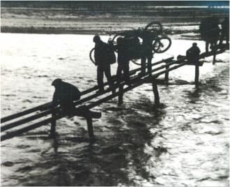 左圖為(wei)改造后的備戰橋,右圖為(wei)昔日涇河(he)沿岸群眾(zhong)搭建簡易木(mu)橋過河(he)的畫面。 (崆峒區(qu)檔(dang)案館供圖)