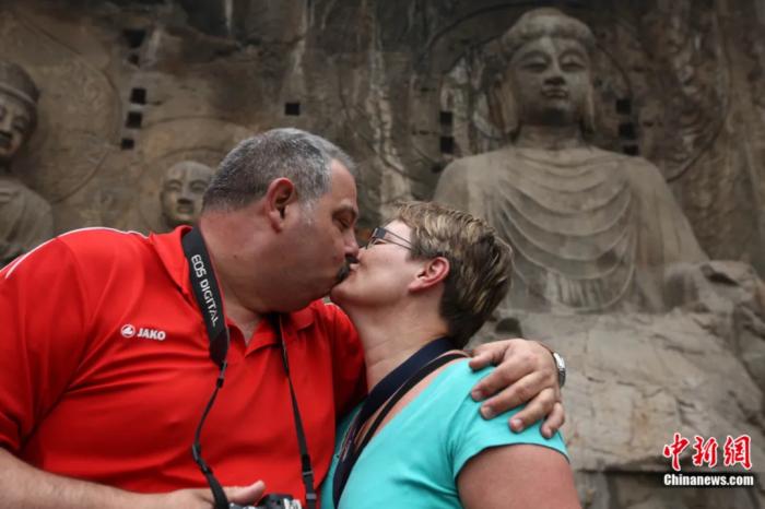 兩(liang)名(ming)外國游客(ke)在河南洛陽龍門石窟盧舍那(nei)大(da)佛前拍照留(liu)念。徐崇(chong)德 攝