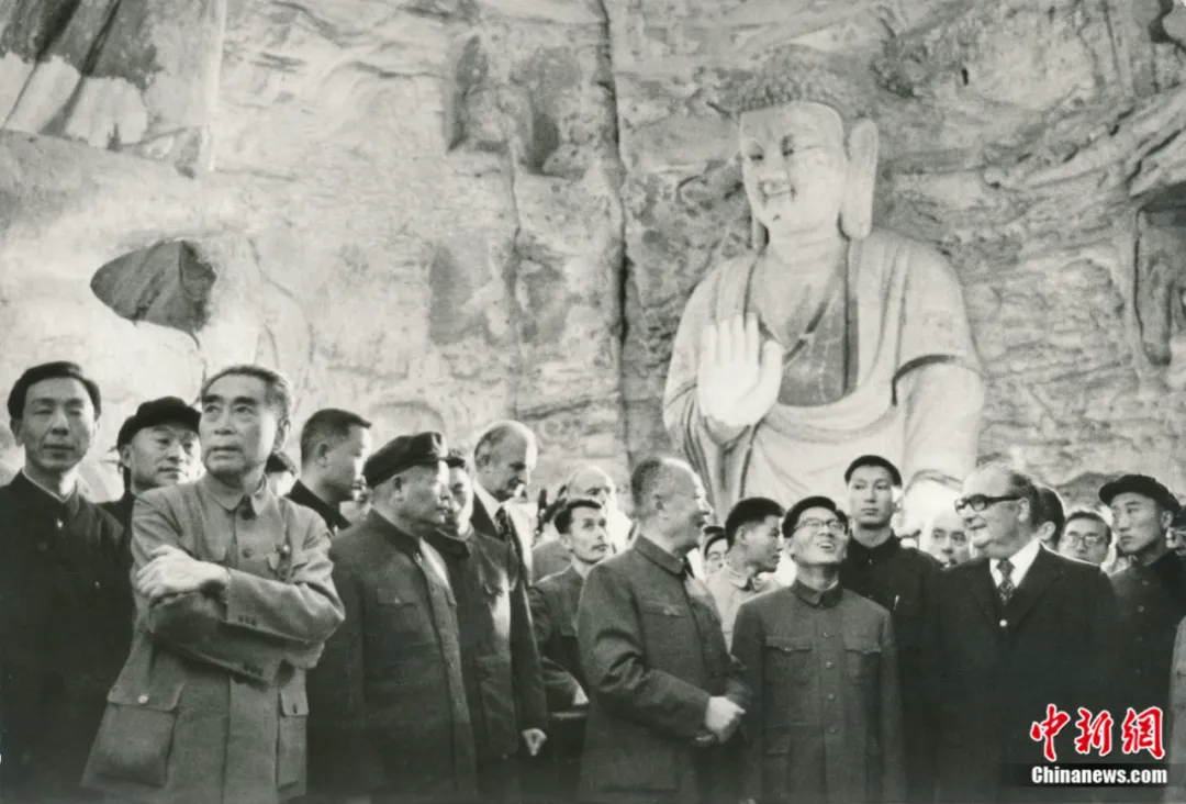 1973年9月15日,周恩(en)來總(zong)理陪同時任法國總(zong)統(tong)喬治·蓬皮杜視察云岡石窟。云岡研究院 供(gong)圖(tu)