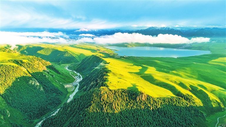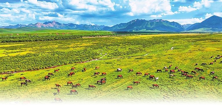 白雪皚(ai)皚(ai)的(de)(de)祁連(lian)山(shan)下,一眼望不到邊的(de)(de)大片牧草青翠碧綠,色(se)彩斑斕的(de)(de)野花競相開放,擁有百萬(wan)畝草原的(de)(de)山(shan)丹馬場(chang)如巨幅(fu)彩色(se)畫卷徐徐展(zhan)開。