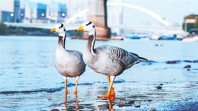 蘭(lan)州市中山橋(qiao)附近的兩(liang)只斑頭雁。(王彬(bin)(bin)彬(bin)(bin)供圖(tu))
