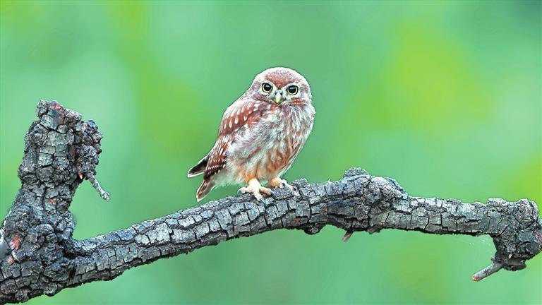 我近距離(li)地看著這小(xiao)小(xiao)的(de)(de)(de)、聰慧的(de)(de)(de)鳥(niao)兒。它(ta)的(de)(de)(de)上(shang)體是(shi)棕黃(huang)色(se)(se)的(de)(de)(de),散(san)布著許多白(bai)點(dian),頭上(shang)的(de)(de)(de)白(bai)點(dian)比身上(shang)的(de)(de)(de)更加細密。貓(mao)頭鷹脖子的(de)(de)(de)轉動(dong)極限大(da)約(yue)是(shi)270度,能水平轉,也能上(shang)下轉,這個“超能力”讓眼前的(de)(de)(de)小(xiao)家(jia)伙能更靈活(huo)機敏(min)地打量我。它(ta)的(de)(de)(de)眼周有一圈兒顯眼的(de)(de)(de)白(bai)色(se)(se),于(yu)喙的(de)(de)(de)上(shang)方幾乎相連,變成兩道白(bai)色(se)(se)的(de)(de)(de)眉(mei)毛,平添了幾分(fen)威武。