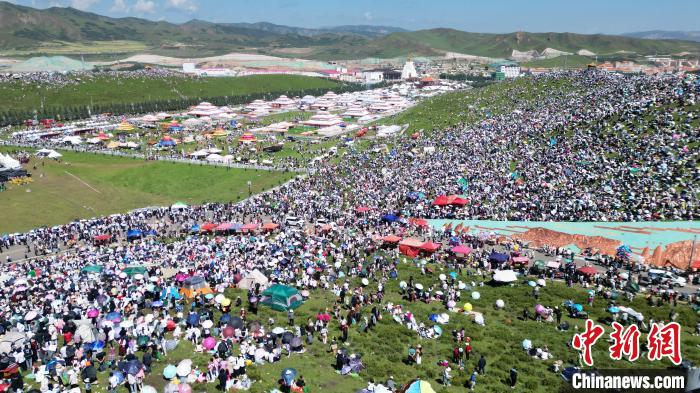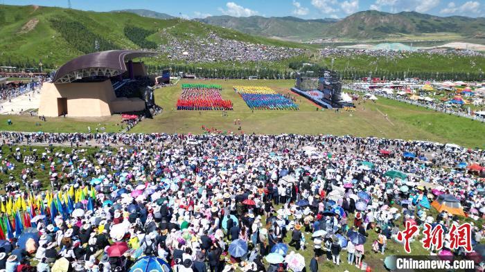 8月4日(ri),人們在當周草原(yuan)觀看九(jiu)色(se)(se)甘(gan)南香(xiang)巴拉(la)旅游藝術(shu)(shu)節(jie)開(kai)幕(mu)式(shi)表(biao)演(yan)。當日(ri),第(di)22屆九(jiu)色(se)(se)甘(gan)南香(xiang)巴拉(la)旅游藝術(shu)(shu)節(jie)在甘(gan)肅省(sheng)甘(gan)南藏族(zu)自治州當周草原(yuan)開(kai)幕(mu)。人們身(shen)著節(jie)日(ri)盛裝載(zai)(zai)歌載(zai)(zai)舞、歡(huan)聚一堂(tang),馬隊巡游、千人鍋莊(zhuang)舞等(deng)活動精彩(cai)上演(yan)。九(jiu)色(se)(se)甘(gan)南香(xiang)巴拉(la)旅游藝術(shu)(shu)節(jie)既是民眾浪山聚會(hui)的節(jie)日(ri)盛會(hui),也(ye)是展現(xian)發展成就、擴大對外開(kai)放的重要(yao)窗口,更是展示民俗文化(hua)、促進(jin)廣泛交往交流交融(rong)的有(you)效載(zai)(zai)體。(無人機照片)中新社記者 九(jiu)美(mei)旦增 攝