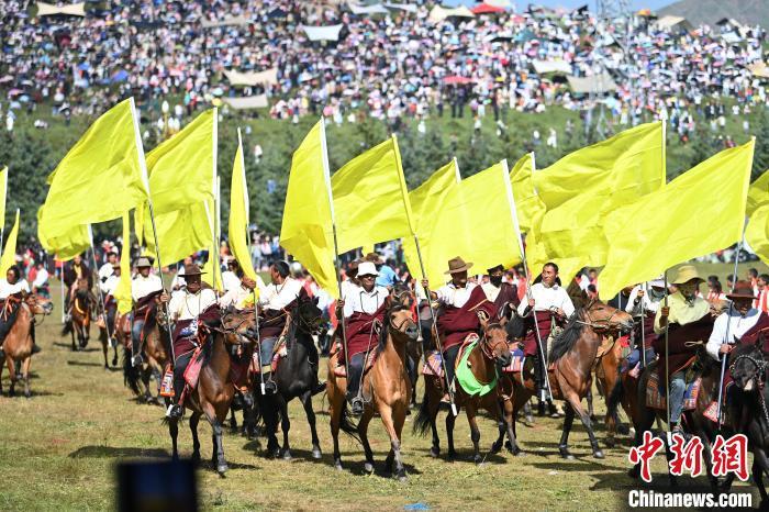 8月4日,第22屆九(jiu)色甘南(nan)香巴(ba)拉旅游藝術節(jie)在甘肅省甘南(nan)藏族自(zi)治州當周(zhou)草原(yuan)開幕(mu)。人們身著節(jie)日盛裝載(zai)歌載(zai)舞、歡(huan)聚一堂,馬隊(dui)巡游、千人鍋莊舞等活(huo)動(dong)精(jing)彩上演。九(jiu)色甘南(nan)香巴(ba)拉旅游藝術節(jie)既是(shi)民(min)眾浪山聚會的節(jie)日盛會,也是(shi)展(zhan)現(xian)發展(zhan)成就(jiu)、擴大對外開放的重要窗口,更是(shi)展(zhan)示民(min)俗文化、促進(jin)廣(guang)泛交(jiao)往交(jiao)流(liu)交(jiao)融的有效(xiao)載(zai)體。圖為開幕(mu)式現(xian)場。中(zhong)新(xin)社記者(zhe) 九(jiu)美旦增(zeng) 攝