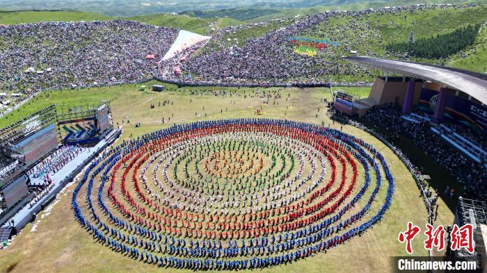 8月4日,第22屆九色(se)甘(gan)(gan)南(nan)香(xiang)巴拉(la)旅(lv)游藝(yi)術節在甘(gan)(gan)肅省(sheng)甘(gan)(gan)南(nan)藏族自治州當周草原(yuan)開(kai)(kai)幕。人(ren)(ren)們(men)身著節日盛裝載歌載舞(wu)、歡(huan)聚一堂(tang),馬隊巡游、千人(ren)(ren)鍋(guo)莊舞(wu)等(deng)活動精(jing)彩上演(yan)。九色(se)甘(gan)(gan)南(nan)香(xiang)巴拉(la)旅(lv)游藝(yi)術節既是(shi)(shi)民(min)眾浪山聚會(hui)的(de)(de)(de)節日盛會(hui),也(ye)是(shi)(shi)展現發(fa)展成(cheng)就、擴大對外(wai)開(kai)(kai)放的(de)(de)(de)重(zhong)要窗口,更(geng)是(shi)(shi)展示民(min)俗文化、促進(jin)廣泛(fan)交往交流交融的(de)(de)(de)有效(xiao)載體(ti)。圖為(wei)開(kai)(kai)幕式現場(chang)千人(ren)(ren)鍋(guo)莊舞(wu)表演(yan)。(無人(ren)(ren)機照片)中新社記者(zhe) 九美(mei)旦增 攝