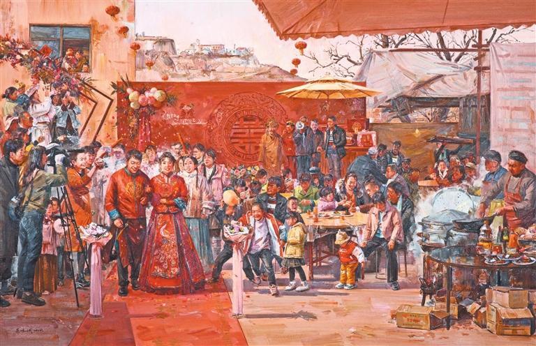 《成紀二(er)月(yue)喜盈門》描繪了秦安一(yi)對新(xin)人(ren)(ren)舉(ju)辦婚禮的(de)場景。身著(zhu)傳統服飾的(de)新(xin)人(ren)(ren),在(zai)親朋好友祝福中朝觀眾走(zou)來。靜心觀察(cha),會發現每(mei)個人(ren)(ren)都充滿鮮明的(de)角色感(gan),樸拙的(de)外表、內蘊的(de)情感(gan)、濃厚的(de)民(min)俗、歡樂的(de)場景,共(gong)同交(jiao)織成一(yi)方地域上的(de)斑(ban)斕畫卷(juan)。