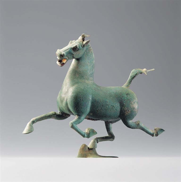 銅(tong)奔馬(ma)(ma),東漢,1969年(nian)武威市(shi)雷臺(tai)墓出土(tu)。馬(ma)(ma)作(zuo)(zuo)奔騰狀(zhuang),三足(zu)騰空(kong),右(you)后蹄踏一展(zhan)翅飛翔、回首驚顧的(de)(de)飛鳥。奔馬(ma)(ma)全(quan)身著力點集于超掠飛鳥的(de)(de)一足(zu)之上,準確地把握了(le)力學平衡(heng)。蹄踏飛鳥,表現出馬(ma)(ma)行(xing)迅疾,在鳥驚回首的(de)(de)剎那已經超越了(le)飛行(xing)的(de)(de)鳥。銅(tong)奔馬(ma)(ma)鑄造(zao)精美,構思(si)巧妙,為(wei)(wei)我國(guo)(guo)青銅(tong)藝術(shu)中(zhong)(zhong)罕見的(de)(de)杰作(zuo)(zuo),1983年(nian)被確定為(wei)(wei)中(zhong)(zhong)國(guo)(guo)旅游標志,2002年(nian)被國(guo)(guo)家(jia)文(wen)(wen)物(wu)局列(lie)入首批禁止出國(guo)(guo)(境)展(zhan)覽文(wen)(wen)物(wu)目錄。它(ta)以卓絕的(de)(de)藝術(shu)造(zao)詣千古生輝,成為(wei)(wei)中(zhong)(zhong)華民族勇往直前、積極進取偉大氣質的(de)(de)象(xiang)征(zheng)。