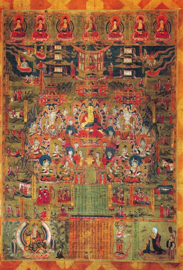 該(gai)畫(hua)為絹地設(she)色,出自敦煌莫高窟藏經(jing)(jing)洞。畫(hua)面中心為說(shuo)(shuo)法圖,一佛(fo)(fo)二菩(pu)薩法相莊嚴,諸(zhu)菩(pu)薩、弟子、比丘、比丘尼、優婆塞、優婆夷等“赴(fu)會(hui)圣(sheng)眾(zhong)”圍繞(rao)周(zhou)圍。兩側(ce)及上方分布(bu)(bu)15幅經(jing)(jing)變(bian)故事圖,以連環畫(hua)形式鋪陳展現《佛(fo)(fo)說(shuo)(shuo)父(fu)(fu)母(mu)恩重經(jing)(jing)》的基本內容。其上繪(hui)七佛(fo)(fo)、彌(mi)勒與七寶,其下(xia)墨書《佛(fo)(fo)說(shuo)(shuo)報(bao)父(fu)(fu)母(mu)恩重經(jing)(jing)變(bian)》。絹畫(hua)最下(xia)方自左向右排(pai)布(bu)(bu)地藏菩(pu)薩、《繪(hui)佛(fo)(fo)邈真(zhen)紀》、引(yin)路菩(pu)薩及比丘尼戒行邈真(zhen)像(xiang)。該(gai)絹畫(hua)保存(cun)完整(zheng),色彩絢(xuan)麗,是敦煌《佛(fo)(fo)說(shuo)(shuo)父(fu)(fu)母(mu)恩重經(jing)(jing)》諸(zhu)變(bian)相中,內容最復雜,畫(hua)面情(qing)節最多,特點最鮮明(ming),風(feng)格最獨特的一幅,且有宋淳(chun)化二年(nian)(公元991年(nian))明(ming)確(que)紀年(nian),具(ju)有重要(yao)的歷史(shi)、藝術和研(yan)究價值(zhi)。