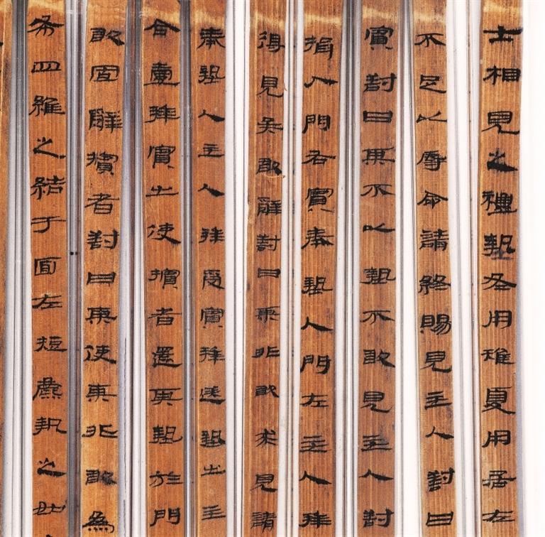 《儀(yi)禮(li)》簡,西漢(han),武(wu)威磨嘴(zui)子(zi)出土。分木質(zhi)和竹質(zhi)兩種,共496枚(mei),編(bian)為(wei)甲、乙(yi)、丙三本(ben)(ben),系先編(bian)后寫。甲本(ben)(ben)為(wei)《儀(yi)禮(li)》17篇(pian)(pian)中的(de)7篇(pian)(pian),乙(yi)本(ben)(ben)僅存(cun)(cun)《服(fu)傳》一篇(pian)(pian),丙本(ben)(ben)僅存(cun)(cun)《喪服(fu)》一篇(pian)(pian)。該簡冊(ce)保存(cun)(cun)基本(ben)(ben)完好,與(yu)傳世的(de)鄭玄(xuan)注本(ben)(ben)不同,應是目前所見《儀(yi)禮(li)》的(de)最(zui)古寫本(ben)(ben),在版(ban)本(ben)(ben)校(xiao)勘(kan)上(shang)有很高的(de)價值,且書寫工整秀(xiu)麗,是漢(han)代墨寫隸書的(de)上(shang)品。