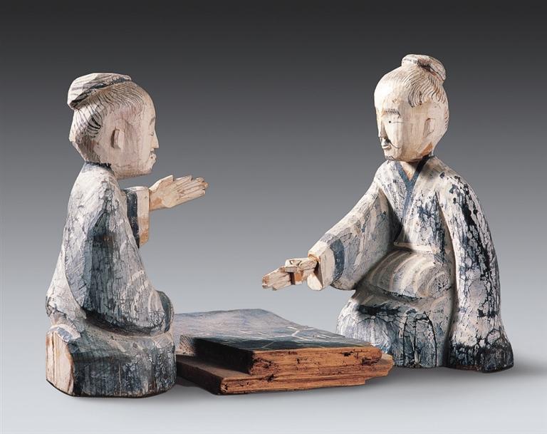 彩(cai)繪(hui)木(mu)六(liu)博(bo)(bo)俑,西漢,武威(wei)磨嘴子出土。木(mu)俑為兩位跪坐(zuo)對(dui)局(ju)的(de)老者形象,二(er)者間設一(yi)長(chang)方形棋(qi)盤。老者神情凝滯,蓄(xu)勢待發,顯然正在緊(jin)張的(de)六(liu)博(bo)(bo)對(dui)局(ju)之中。考古(gu)發現中不(bu)乏(fa)漢代博(bo)(bo)局(ju)、棋(qi)子、骰子等六(liu)博(bo)(bo)器具,漢墓畫像磚中也常見相(xiang)關(guan)圖像,但以雕塑刻畫六(liu)博(bo)(bo)對(dui)局(ju)卻極為罕(han)見,這件文(wen)物充分體(ti)現了漢代木(mu)雕藝術所達(da)到(dao)的(de)高(gao)度與境界(jie)。