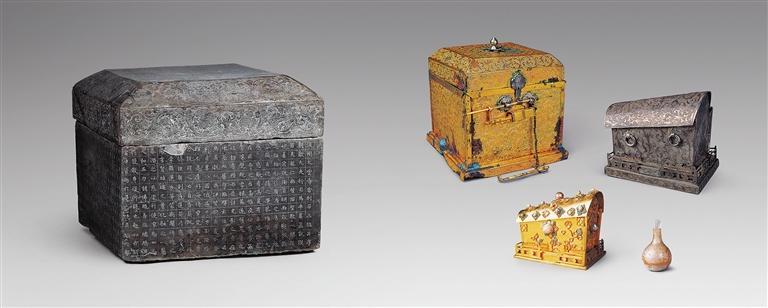 大云(yun)(yun)寺(si)五(wu)重(zhong)舍(she)(she)(she)利(li)(li)寶函,涇川(chuan)縣(xian)大云(yun)(yun)寺(si)出土。最外層的(de)(de)石(shi)函由質地堅硬的(de)(de)灰(hui)色(se)大理石(shi)制成,四壁(bi)陰刻《涇州大云(yun)(yun)寺(si)舍(she)(she)(she)利(li)(li)石(shi)函銘并(bing)序言》,并(bing)有參與(yu)舍(she)(she)(she)利(li)(li)發(fa)現和奉安(an)儀式的(de)(de)職官、僧眾題(ti)名(ming),共千余字(zi),紀年(nian)為“延載(zai)元(yuan)年(nian)”(公(gong)元(yuan)694年(nian))。其內層層套置鎏金(jin)(jin)(jin)銅匣、銀槨、金(jin)(jin)(jin)棺和玻璃(li)舍(she)(she)(she)利(li)(li)瓶,舍(she)(she)(she)利(li)(li)瓶內裝舍(she)(she)(she)利(li)(li)14粒,形如米粒。這(zhe)套舍(she)(she)(she)利(li)(li)容(rong)(rong)器精巧(qiao)華(hua)麗,光彩(cai)奪目,反映(ying)了盛唐時期金(jin)(jin)(jin)銀細工的(de)(de)最高技(ji)藝。這(zhe)套舍(she)(she)(she)利(li)(li)容(rong)(rong)器是考(kao)古發(fa)現最早的(de)(de)以(yi)中國傳統(tong)棺槨制度設計舍(she)(she)(she)利(li)(li)容(rong)(rong)器,并(bing)置于地宮之(zhi)中實例,是佛教(jiao)文化與(yu)中國本(ben)土習(xi)俗相融合(he)的(de)(de)重(zhong)要實物見證。