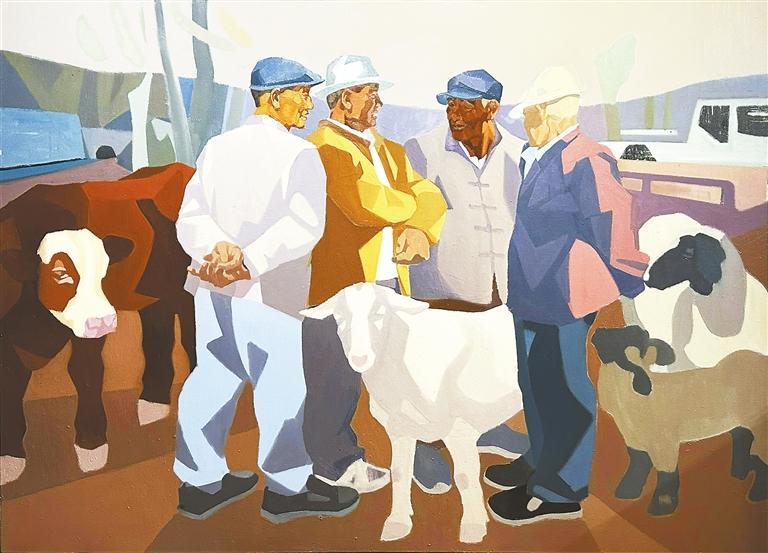《和風》系列作品取材于禮縣鹽官鎮騾(luo)馬(ma)市場(chang)逢集時交易的(de)場(chang)景(jing)。幼時,我(wo)經常(chang)隨父(fu)親去鹽官騾(luo)馬(ma)市場(chang)趕(gan)集,對這(zhe)個場(chang)景(jing)熟悉且親切。也正因為(wei)如此,我(wo)對這(zhe)個題材有著(zhu)難以割舍(she)的(de)情愫,總是忍不住想(xiang)通(tong)過畫筆呈現這(zhe)一記憶。