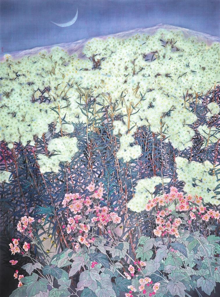 《白露》主要以白色野花(hua)香(xiang)青為主體(ti),野棉花(hua)為輔。拉長香(xiang)青的(de)枝(zhi)干(gan),以增強(qiang)畫面(mian)(mian)的(de)氣勢,繁茂的(de)白花(hua)溫馨、浪(lang)漫,婀娜的(de)野棉花(hua)花(hua)朵打破畫面(mian)(mian)的(de)單調(diao)(diao),葉子又構成小團(tuan)塊整體(ti)。夜幕下一輪新月,應和(he)著紫灰色的(de)畫面(mian)(mian)主色調(diao)(diao),增強(qiang)了(le)這種美好(hao)氛圍。