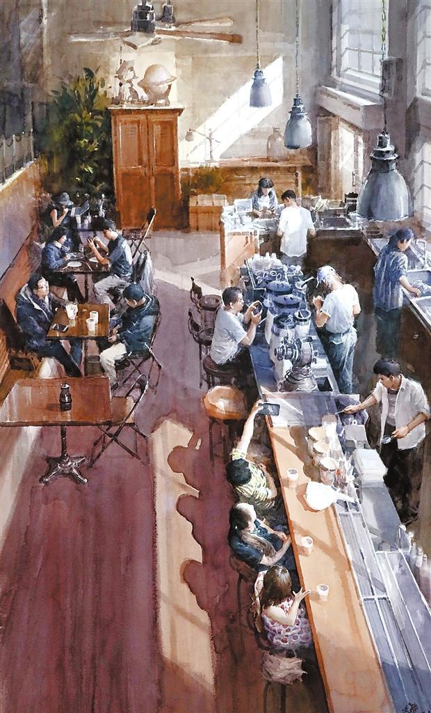 《網紅(hong)咖(ka)啡(fei)館的(de)(de)(de)午后(hou)》用(yong)(yong)寫(xie)實方法展(zhan)現(xian)(xian)了一個溫馨的(de)(de)(de)生活場(chang)景。在(zai)構圖上,以俯視的(de)(de)(de)角(jiao)度用(yong)(yong)大(da)場(chang)景來做整(zheng)體畫(hua)面(mian)的(de)(de)(de)籌劃,在(zai)整(zheng)體色調上以沉穩厚重的(de)(de)(de)暖色作(zuo)(zuo)為基(ji)調,把光線穿插、引入到畫(hua)面(mian)中。在(zai)布(bu)局(ju)上,以陽光照耀下的(de)(de)(de)咖(ka)啡(fei)館吧臺(tai)為主要表現(xian)(xian)組群(qun),分(fen)別刻畫(hua)、塑造了工作(zuo)(zuo)中的(de)(de)(de)前(qian)臺(tai)人(ren)員(yuan)、打卡拍照的(de)(de)(de)女性顧客群(qun);把暗部(bu)區域,幾組在(zai)咖(ka)啡(fei)桌邊交談、用(yong)(yong)餐、喝咖(ka)啡(fei)的(de)(de)(de)顧客群(qun)作(zuo)(zuo)為第二層次,展(zhan)現(xian)(xian)他(ta)們(men)不同的(de)(de)(de)神情和體態(tai);然后(hou)完善整(zheng)體的(de)(de)(de)空間感。在(zai)用(yong)(yong)筆(bi)上盡量(liang)以松動的(de)(de)(de)筆(bi)觸,又能(neng)展(zhan)現(xian)(xian)細(xi)節的(de)(de)(de)方式(shi)來塑造,利用(yong)(yong)水彩畫(hua)需(xu)要干、濕、松、緊相結合(he),多(duo)層次、多(duo)遍數進(jin)行渲染(ran)的(de)(de)(de)特性,盡可能(neng)達到預(yu)期效果(guo)。 (本版(ban)文圖由(you)甘肅省美術家協會提供(gong))