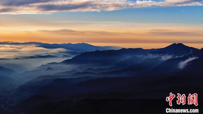 8月14日晚(wan),蘭州市榆(yu)中(zhong)縣馬坡鄉,夕(xi)陽在云(yun)海(hai)里翻滾,映照大地和村莊城鎮,美(mei)不勝(sheng)收。圖為(wei)云(yun)海(hai)日落(luo)籠(long)罩黛(dai)青色(se)山(shan)脈。丁(ding)永睿 攝(she)