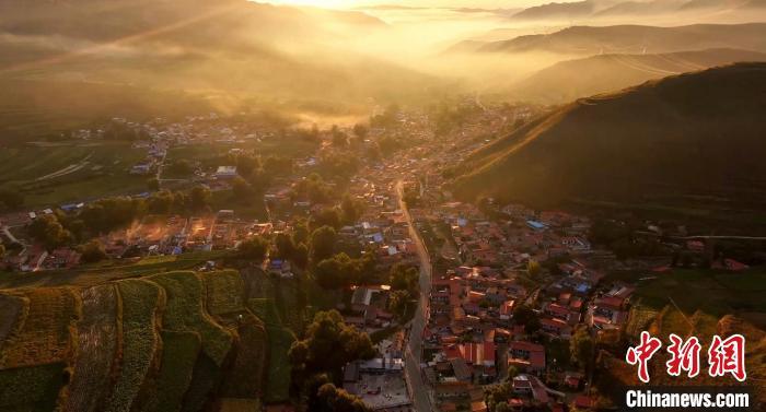 8月14日晚,蘭州市榆中縣馬坡鄉,夕陽在云海里翻滾,映照大(da)地(di)和(he)村莊(zhuang)城鎮,美不勝(sheng)收。圖為琥珀色黃昏。丁永睿 攝