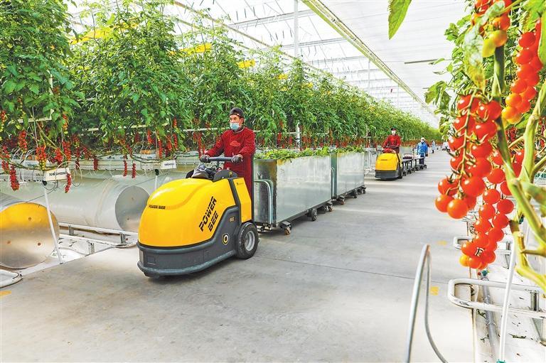 古浪越海農業有(you)限公司智能溫室內,務工人員(yuan)運送小番茄。 武威市融媒體中(zhong)心供圖