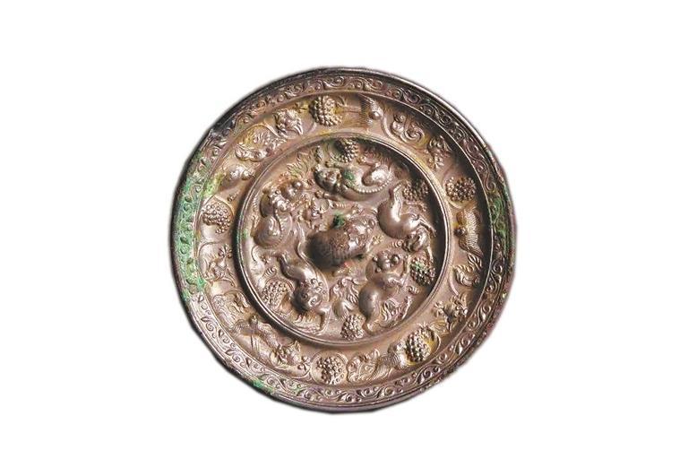 我省天(tian)水市博物館的(de)眾多藏品中,有一(yi)面(mian)海獸葡萄紋銅鏡(jing),大(da)致(zhi)出現于(yu)武(wu)則天(tian)執政時(shi)期(684年(nian)—705年(nian))。銅鏡(jing)上(shang)(shang)五只瑞獸作匍(pu)匐狀,攀援(yuan)著(zhu)(zhu)(zhu)葡萄枝蔓,這里的(de)海獸就是來自西域的(de)獅子(zi),古人稱為“狻(suan)猊”。此外(wai)鏡(jing)上(shang)(shang)葡萄藤葉鋪陳、點(dian)綴著(zhu)(zhu)(zhu)禽(qin)鳥和卷草,精(jing)美絕倫,彰顯著(zhu)(zhu)(zhu)大(da)唐(tang)開放(fang)包容(rong)的(de)盛(sheng)世氣象。