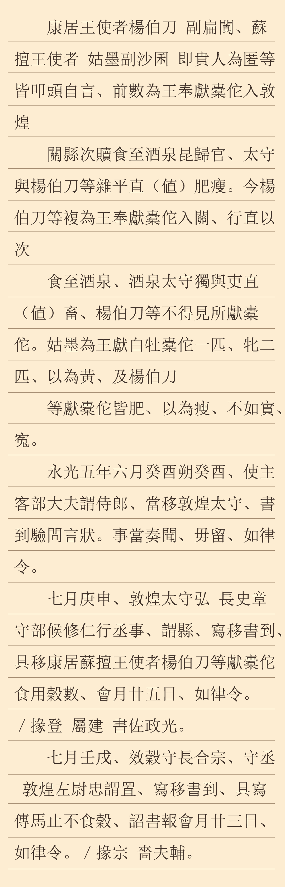 永光(guang)五年六(liu)月(yue)初一日(公元前39年7月(yue)21日),朝廷主(zhu)管對外交(jiao)往和蠻夷事務的(de)使主(zhu)客諫大(da)夫行(xing)(xing)文(wen)(wen)敦(dun)煌,要(yao)求(qiu)敦(dun)煌太守(shou)接(jie)(jie)到文(wen)(wen)件(jian)后對此進行(xing)(xing)查詢并按時上(shang)報中央,不得留遲。七(qi)月(yue)庚申(9月(yue)6日),敦(dun)煌大(da)守(shou)弘、長史章以及兼行(xing)(xing)丞事的(de)守(shou)部候(hou)修仁聯署文(wen)(wen)件(jian),下發效谷(gu)縣,要(yao)求(qiu)縣廷接(jie)(jie)到文(wen)(wen)件(jian)后,將康(kang)居王使者(zhe)路過縣境時為(wei)之(zhi)提供的(de)谷(gu)物數量,在(zai)七(qi)天(tian)之(zhi)內上(shang)報太守(shou)府。文(wen)(wen)書(shu)(shu)中有發文(wen)(wen)時掾、屬、書(shu)(shu)佐的(de)具(ju)名。