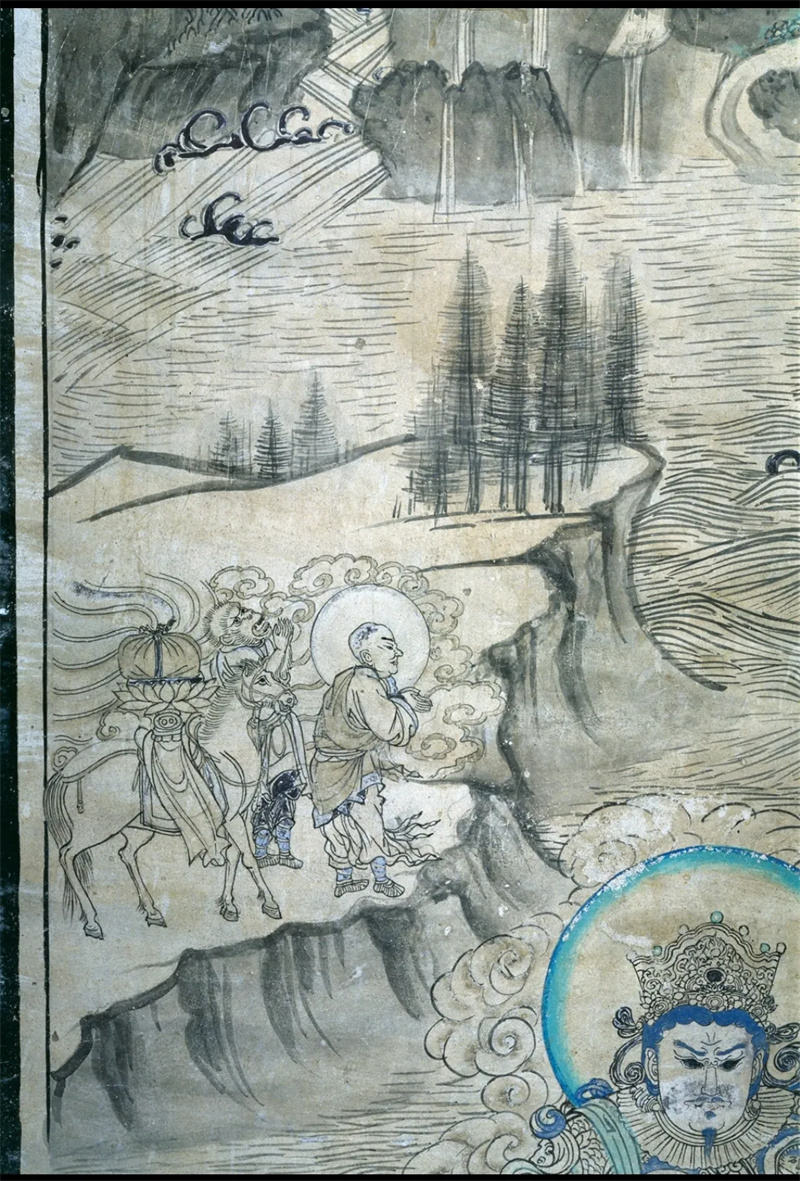 敦(dun)煌壁畫中(zhong)(zhong)現(xian)存(cun)六(liu)幅唐僧(seng)取(qu)(qu)經圖,其中(zhong)(zhong)時(shi)代最(zui)早、保存(cun)最(zui)完好的(de)一(yi)幅繪于西夏時(shi)期榆林(lin)窟(ku)第3窟(ku)的(de)《普賢(xian)變》中(zhong)(zhong)。此幅唐僧(seng)取(qu)(qu)經圖似是(shi)唐僧(seng)師徒(tu)在(zai)取(qu)(qu)經途中(zhong)(zhong)遭遇難關,誠心祈求(qiu)菩薩協助(zhu)渡難。圖中(zhong)(zhong),唐僧(seng)身(shen)披(pi)袈裟(sha),雙手合(he)十(shi),彎腰向前,遙望普賢(xian)菩薩參(can)拜。唐僧(seng)身(shen)后,長相(xiang)似猴的(de)人(ren)雙手合(he)十(shi),抬頭仰(yang)望,向普賢(xian)致禮(li),他就是(shi)孫悟(wu)空的(de)原型(xing)——石磐陀。師徒(tu)身(shen)后有一(yi)匹白馬,靜立等待。他們站在(zai)懸崖(ya)深壑前,面前呈現(xian)山(shan)窮水盡已無路的(de)困境。