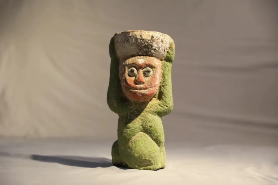 彩繪木猴,漢(han)代,一級文物。武(wu)威(wei)市磨嘴子漢(han)墓出土。寬 17.3 厘米,高 32.5 厘米。木質,由整木削制而成,全(quan)身施(shi)黑(hei)、白、紅三彩,木猴呈蜷縮、蹲臥狀,刀(dao)法簡潔質樸,充滿藝術感。