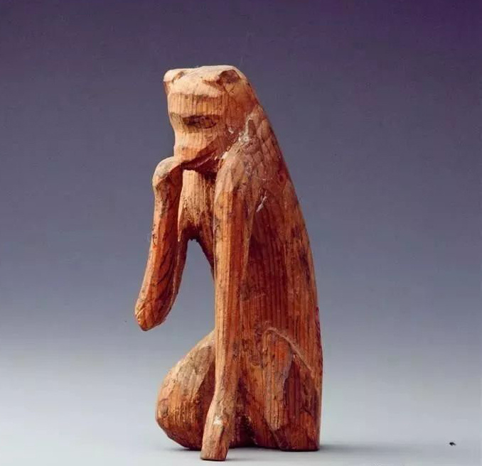 木猴(hou),東漢(han),1957年(nian)甘肅武威磨嘴子出土。此(ci)猴(hou)跪(gui)坐,頭微低,左前(qian)(qian)肢垂直撐地,右(you)前(qian)(qian)肢伸至(zhi)嘴部(bu),似在抿(min)嘴偷笑,又似在品嘗食物。整個雕塑(su)用黑、紅兩色彩繪,形體小巧,刀法簡練,將一(yi)(yi)只調皮的(de)猴(hou)子微感惶惑的(de)瞬(shun)間神態刻(ke)畫入微。該(gai)作(zuo)品用一(yi)(yi)塊木頭雕成,是漢(han)代雕刻(ke)中(zhong)的(de)佳(jia)作(zuo)。