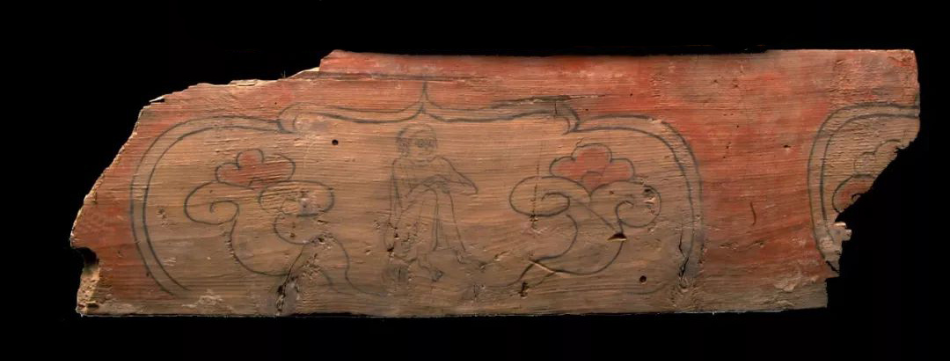 彩繪“猴”生肖木(mu)版(ban)畫,唐代(dai),一(yi)級文物。1979年(nian)肅南(nan)縣大長(chang)嶺唐墓出土。木(mu)版(ban)畫長(chang)73厘米,寬22厘米,猴生肖木(mu)版(ban)畫呈長(chang)方形,墨筆(bi)雙線勾勒一(yi)壸門開光。壸門內墨線勾勒一(yi)猴,其雙手環抱膝(xi)蓋至(zhi)胸(xiong)前,猴身兩側繪有兩朵升騰祥云。壸門外飾(shi)以土紅色。