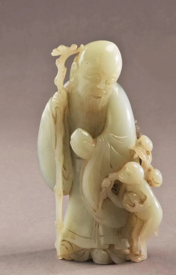 玉(yu)壽星,清代(dai),高(gao)15.5厘(li)(li)米(mi),寬(kuan)9厘(li)(li)米(mi),厚4.7厘(li)(li)米(mi)。用(yong)整塊和(he)田青白籽料琢制,正面玉(yu)質(zhi)潔白溫潤,背(bei)部有(you)黑灰(hui)泌色。壽星頭(tou)微(wei)左傾,桃(tao)(tao)(tao)額,慈目善眉(mei),大(da)耳長頸,著廣袖(xiu)大(da)袍,左手持壽桃(tao)(tao)(tao),右手持龍首杖,袍下微(wei)露云頭(tou)履。左側有(you)一(yi)躬身站立(li)猴子,左臂抱(bao)一(yi)壽桃(tao)(tao)(tao),右肩扛桃(tao)(tao)(tao)枝(zhi)。玉(yu)雕(diao)為俏色雕(diao)刻而成,融圓雕(diao)、線刻、透雕(diao)等手法,將壽星的慈祥和(he)小猴子的可愛(ai)表現于一(yi)體。