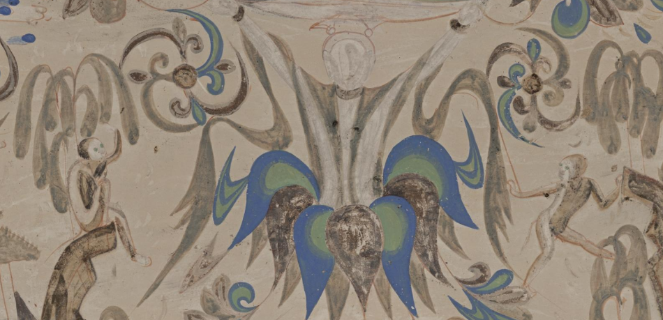在這(zhe)一壁(bi)畫(hua)中共畫(hua)了五只猴子,其中有兩只猴子在有摩尼寶珠的蓮花下面(mian)玩耍(shua),猴子尾巴高高翹起,尖嘴大臉,似乎在用手攀折蓮枝,畫(hua)面(mian)構圖(tu)簡(jian)練生(sheng)動。