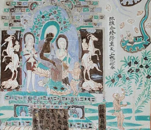 壁畫(hua)畫(hua)面右(you)側有(you)一(yi)飛天正在(zai)散(san)花,云(yun)端之(zhi)下是(shi)一(yi)棵茂盛的大樹(shu),一(yi)只猴子正仰著頭,一(yi)手(shou)舉起做(zuo)采摘狀。其(qi)旁(pang)側有(you)白底墨(mo)書題記寫著“獼猴命終得生(sheng)天上散(san)花供養”。畫(hua)面右(you)側一(yi)佛坐蓮(lian)花座之(zhi)上,兩旁(pang)一(yi)弟子一(yi)菩薩(sa)協侍左(zuo)右(you),一(yi)只猴子雙手(shou)捧(peng)一(yi)缽,虔誠地供養佛。