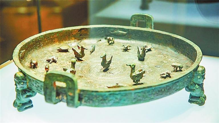 不同于大多數(shu)青銅盤,晉公盤的(de)平底淺(qian)腹內(nei),鑄(zhu)有(you)眾(zhong)多的(de)立體(ti)動物雕塑(su)。在它(ta)底部中心有(you)一(yi)(yi)對(dui)浮雕游龍(long)回旋盤繞,雙(shuang)龍(long)之內(nei)站著一(yi)(yi)只(zhi)水鳥,雙(shuang)龍(long)之外又(you)(you)有(you)四只(zhi)水鳥和四只(zhi)烏龜。再向外延,又(you)(you)有(you)三只(zhi)青蛙(wa)和三條游魚。最外一(yi)(yi)圈,是數(shu)只(zhi)青蛙(wa)和烏龜,它(ta)們(men)或蹲(dun)或游,或者爬行,非常(chang)生動鮮活。這(zhe)些動物的(de)制(zhi)作展示了工匠(jiang)的(de)心靈巧思,鳥喙可以自由開合(he),龜首(shou)能夠如意伸縮(suo),原地(di)還能進(jin)(jin)行360度(du)轉體(ti),既體(ti)現了青銅冶鑄(zhu)技術(shu)的(de)高(gao)超,亦體(ti)現了機械制(zhi)作技術(shu)的(de)進(jin)(jin)步。