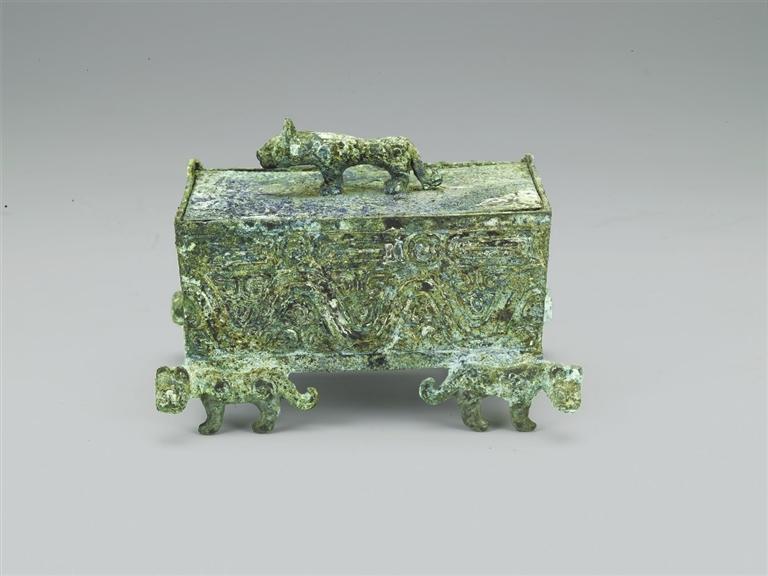 1993年山西(xi)省曲(qu)沃縣(xian)北趙(zhao)村晉(jin)侯(hou)墓(mu)地(di)62號墓(mu)出(chu)土(tu)。波曲(qu)紋虎(hu)(hu)足方(fang)盒(he)為(wei)生(sheng)活(huo)用具,出(chu)土(tu)于晉(jin)穆侯(hou)夫人墓(mu)。盒(he)為(wei)長方(fang)形,口徑(jing)略大于底(di)徑(jing),斜直壁(bi),頂部(bu)有(you)立體的虎(hu)(hu)形捉(zhuo)手(shou),兩扇小蓋可(ke)以開(kai)啟(qi),盒(he)下有(you)四(si)虎(hu)(hu)為(wei)四(si)足,虎(hu)(hu)首朝外。盒(he)四(si)壁(bi)上部(bu)飾(shi)(shi)鱗(lin)紋,下部(bu)飾(shi)(shi)波曲(qu)紋。此盒(he)設計精巧,器型較小,紋飾(shi)(shi)精美,應是古(gu)代貴(gui)族女(nv)性用來珍藏小型物件的容器。