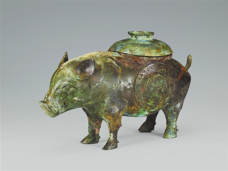 中(zhong)國是(shi)最早(zao)把(ba)野(ye)豬(zhu)馴化為家(jia)(jia)豬(zhu)的(de)(de)(de)國家(jia)(jia)之一。從殷墟出土(tu)的(de)(de)(de)甲骨文材料(liao)看(kan),殷商(shang)時(shi)(shi)期(qi)的(de)(de)(de)養豬(zhu)業相當發達(da),豬(zhu)是(shi)祭(ji)祀中(zhong)的(de)(de)(de)重(zhong)要(yao)祭(ji)品,豬(zhu)的(de)(de)(de)形(xing)象在考古發現(xian)中(zhong)其實并不少見,但商(shang)周時(shi)(shi)期(qi)青銅(tong)器中(zhong)豬(zhu)的(de)(de)(de)形(xing)象卻(que)比較罕見,尤其是(shi)青銅(tong)豬(zhu)形(xing)酒器僅見三件:商(shang)代豬(zhu)尊、商(shang)代青銅(tong)豬(zhu)卣(you)、西(xi)周晉侯豬(zhu)尊。