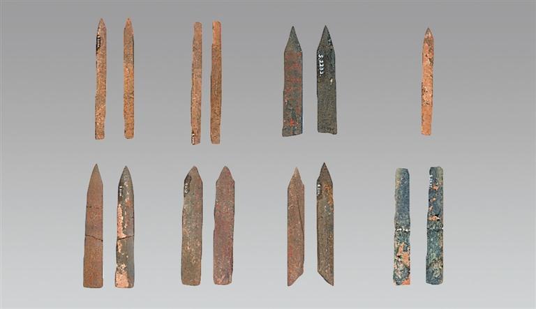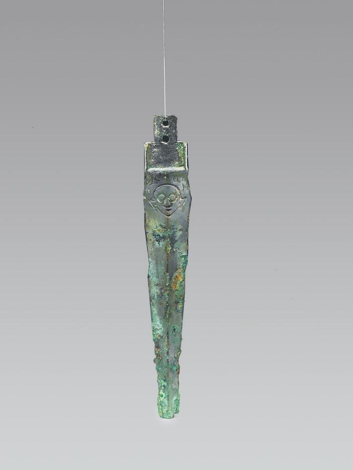 山西(xi)省絳縣橫(heng)水墓(mu)地出(chu)(chu)土。身(shen)呈(cheng)長條(tiao)形,中部起脊,兩(liang)(liang)刃斜直,刃緣鋒利(li),劍身(shen)橫(heng)截面(mian)呈(cheng)菱形。莖格部平面(mian)呈(cheng)“凸(tu)”字形,有(you)闌,側闌凸(tu)起,橫(heng)截面(mian)呈(cheng)“工”字形,后端(duan)較窄(zhai),有(you)兩(liang)(liang)個圓穿。劍身(shen)近莖格處兩(liang)(liang)面(mian)均飾陰(yin)線(xian)人(ren)面(mian)紋(wen)。雙合范鑄造。兩(liang)(liang)面(mian)人(ren)面(mian)紋(wen)頭(tou)頂(ding)上方鑄銘文(wen):“楚(chu)公逆□□中戈(ge)。”考古人(ren)員推斷(duan),有(you)可能(neng)該件器(qi)物的(de)作(zuo)器(qi)者為(wei)楚(chu)公逆,與(yu)晉侯墓(mu)地M64出(chu)(chu)土的(de)楚(chu)公逆編鐘、宋代嘉魚縣出(chu)(chu)土的(de)楚(chu)公逆鐘的(de)作(zuo)器(qi)者為(wei)同一人(ren)。