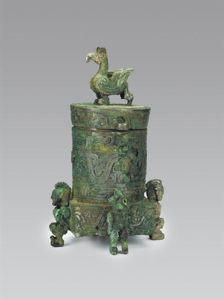 山(shan)西省曲(qu)沃縣北趙村晉(jin)侯墓地(di)63號墓出土。圓筒形(xing)(xing)(xing),帶蓋(gai)(gai),蓋(gai)(gai)與器(qi)(qi)體(ti)(ti)以子(zi)母口套(tao)合,蓋(gai)(gai)平(ping)頂(ding),上有(you)(you)圓雕立鳥形(xing)(xing)(xing)鈕,鳥彎喙,雙(shuang)目圓睜(zheng),作展(zhan)翅(chi)欲飛(fei)狀(zhuang)。器(qi)(qi)為平(ping)口,口沿(yan)有(you)(you)一(yi)(yi)對貫耳(er),直壁(bi),方(fang)形(xing)(xing)(xing)底座(zuo),底座(zuo)四壁(bi)各有(you)(you)一(yi)(yi)個(ge)人形(xing)(xing)(xing)足以承(cheng)器(qi)(qi)體(ti)(ti)。人發髻高聳,赤(chi)身裸體(ti)(ti),屈膝下(xia)蹲,作奮力(li)抬舉器(qi)(qi)物(wu)狀(zhuang),形(xing)(xing)(xing)象寫實生(sheng)動。方(fang)座(zuo)飾(shi)(shi)(shi)波曲(qu)紋(wen)(wen),內(nei)底有(you)(you)兩只小鈴(ling),可發聲。蓋(gai)(gai)頂(ding)飾(shi)(shi)(shi)斜角云紋(wen)(wen)一(yi)(yi)周(zhou)。蓋(gai)(gai)沿(yan)和(he)(he)口沿(yan)飾(shi)(shi)(shi)變形(xing)(xing)(xing)獸體(ti)(ti)紋(wen)(wen),筒腹(fu)和(he)(he)方(fang)座(zuo)飾(shi)(shi)(shi)波曲(qu)紋(wen)(wen),筒下(xia)層(ceng)飾(shi)(shi)(shi)鱗紋(wen)(wen)一(yi)(yi)周(zhou)。這種(zhong)形(xing)(xing)(xing)制(zhi)的青銅器(qi)(qi)尚屬首見,其功用(yong)還(huan)有(you)(you)待于(yu)深入研究,但它獨特(te)的藝術造型和(he)(he)裝飾(shi)(shi)(shi)卻可以說是(shi)集眾器(qi)(qi)之長,獨步天下(xia)。