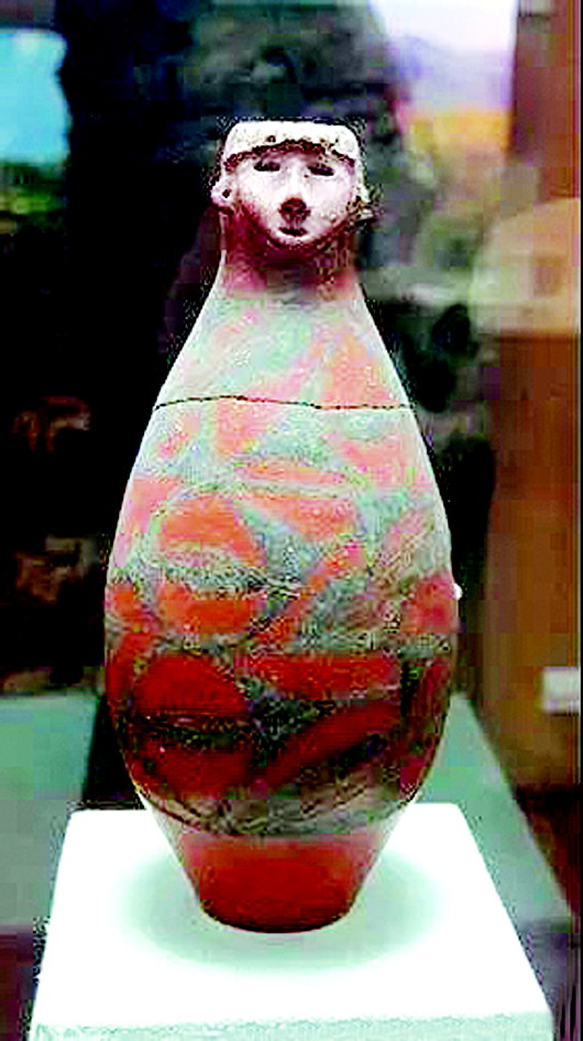 先民的(de)創意,常常讓后(hou)人目瞪口呆。許(xu)多初次見到天水(shui)秦安大地灣人頭(tou)形器口彩(cai)陶瓶的(de)人,就是這種感(gan)覺。這件彩(cai)陶瓶雖然是約6000年(nian)的(de)作品,但(dan)其依(yi)舊時尚,依(yi)舊不(bu)落伍。