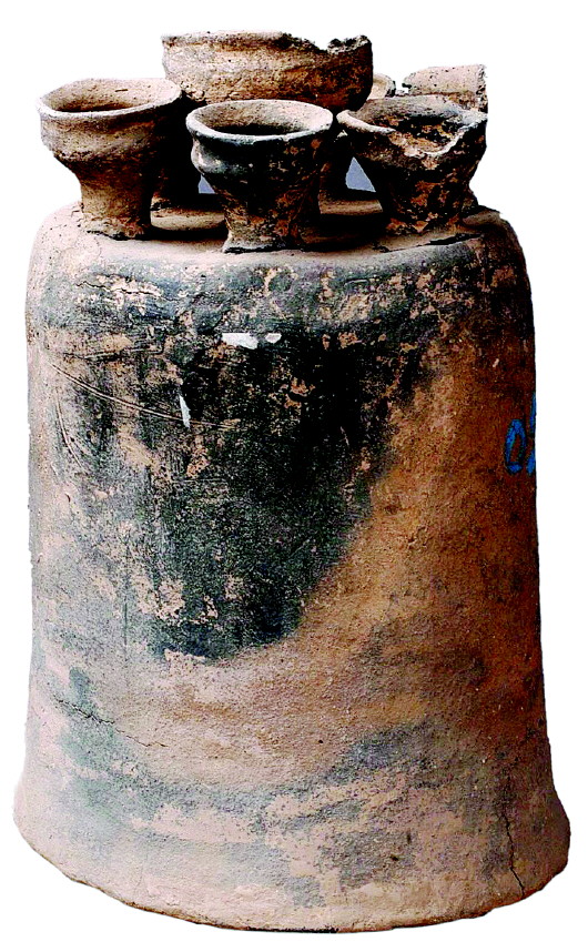 寺洼(wa)文化(hua)灰陶聯盞(zhan),通身為(wei)泥質灰陶,主體呈(cheng)一(yi)(yi)倒(dao)扣的(de)鐘形(xing),在(zai)鐘形(xing)體的(de)頂端粘連著七個(ge)豆狀盞(zhan)杯(bei)。其中(zhong)中(zhong)間一(yi)(yi)個(ge)稍(shao)大略高,其他六個(ge)稍(shao)小一(yi)(yi)些(xie),等距分布在(zai)中(zhong)央一(yi)(yi)個(ge)的(de)周圍,呈(cheng)眾星拱月之狀。