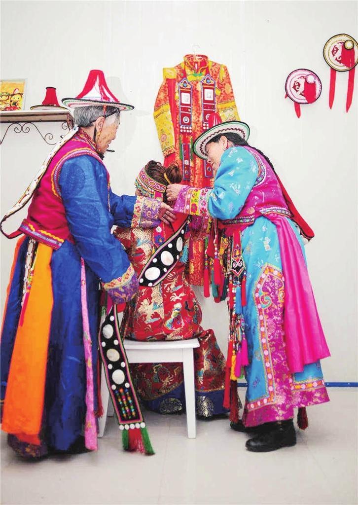 悠揚的(de)歌聲(sheng)中,即(ji)將出嫁的(de)女孩,在兩(liang)位少婦的(de)精心裝(zhuang)扮下(xia),改(gai)變了發式(shi),戴(dai)上(shang)喇叭形氈帽,佩戴(dai)上(shang)胸飾和背(bei)飾,戴(dai)上(shang)用銀牌(pai)、玉石、珊(shan)瑚、瑪瑙、海貝等編制成的(de)頭面。