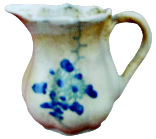 該口杯高10cm,上口手捏黏泥(ni)接連,珍珠(zhu)釉澆注粘(zhan)連處(chu)留(liu)有數滴珍珠(zhu)釉淚珠(zhu)。口沿(yan)前傾,連口粘(zhan)痕(hen)明(ming)(ming)顯(xian)裸露(lu)。通體呈吊南瓜分棱,八(ba)(ba)道指泥(ni)壕顯(xian)八(ba)(ba)股棱條。造型珍瓏(long)靈秀,珍貴之(zhi)處(chu)在于上施淺瑪瑙釉,體面(mian)使用藍寶石礦料畫(hua)一束(shu)盛開的菊花(hua)。畫(hua)筆(bi)嫻熟簡練,富有立體感,且活(huo)靈活(huo)現。在背(bei)面(mian)腰中部,用淡青花(hua)題(ti)“□□”二字(zi)(zi),字(zi)(zi)雖(sui)模糊(hu)不清,但胎土細膩,瓷(ci)壁輕(qing)薄又堅硬如(ru)骨,胎底色(se)黃中泛紅,瓷(ci)體表面(mian)青釉中又泛小針褐色(se)點。把手處(chu),窯變為蚯(qiu)蚓(yin)走泥(ni)紋(wen)。這種泥(ni)紋(wen),沉重古(gu)樸,明(ming)(ming)亮而深沉,是釉層(ceng)在干燥或(huo)燒(shao)成(cheng)時發生干裂,后在高溫階段又有釉流入(ru)填補而形成(cheng)的。在民(min)國(guo)以前,蚯(qiu)蚓(yin)紋(wen)曾被作(zuo)為判(pan)斷鈞釉的唯(wei)一標準(zhun)。
