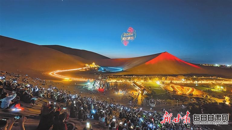 晚9時許,歌曲間隙(xi),600架(jia)無人機緩緩飛起,凌空盤旋,隨著律動,漸(jian)次(ci)變換出(chu)“2024相(xiang)約敦(dun)煌”“萬人星(xing)空演唱(chang)會”等(deng)字(zi)樣,還展現出(chu)鳴沙山(shan)月牙泉、敦(dun)煌莫(mo)高(gao)窟和絲綢之路等(deng)圖案,引來陣(zhen)陣(zhen)歡呼(hu)。