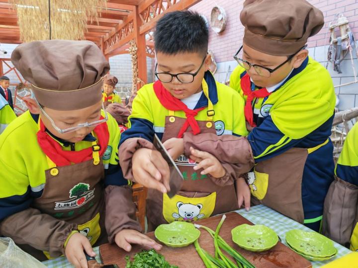 蘭州市城關區伏龍(long)坪小學六(liu)年級(ji)1班(ban)的裴(pei)玉龍(long)(左一)和同學們動(dong)手嘗試切蒜苗(miao)。新華社記者 白麗萍 攝